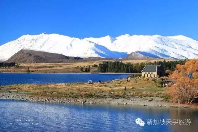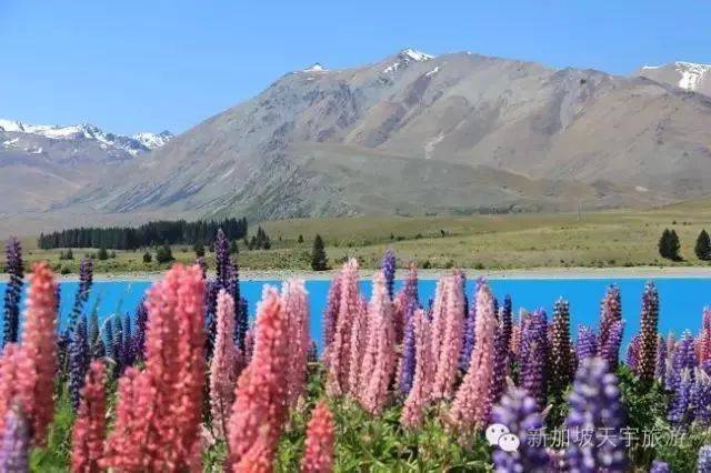 || 白雪皑皑的南阿尔卑斯山,湖边长满了色彩绚丽的鲁冰花,点缀著雪山湖景