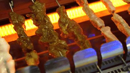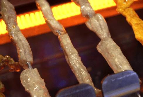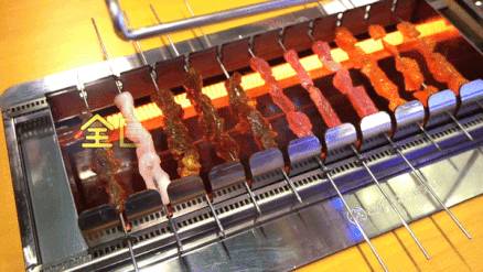 红肉精纯无肥膘,在艳艳火光中由红转褐