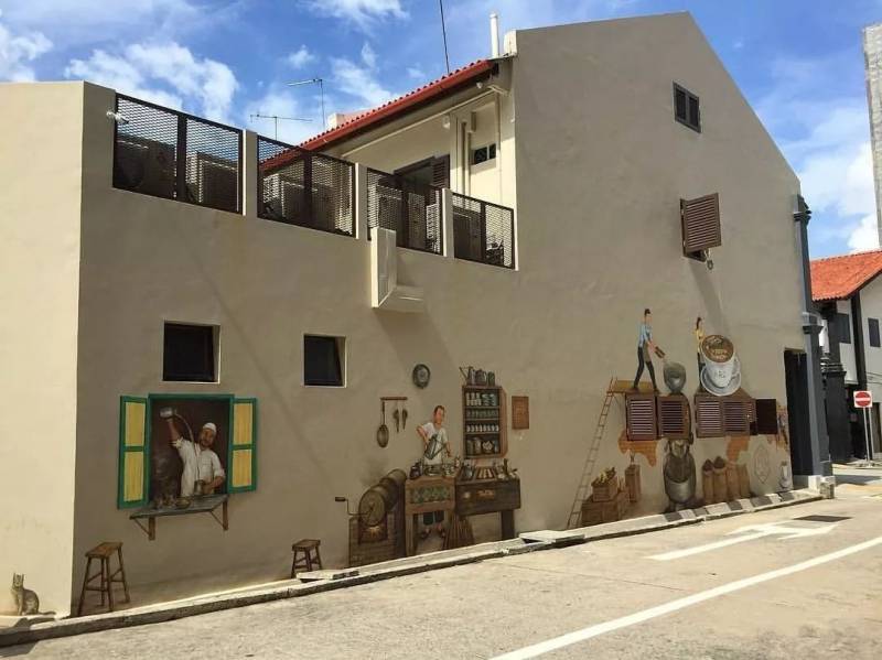 在新加坡苏丹门(Sultan Gate)A.R.C CAFE的外墙上,一副约12米长的壁画《咖啡故事》吸睛无数。