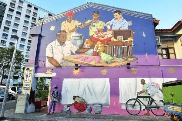小印度的街头壁画颜色鲜艳,让人印象深刻。哈芝巷的壁画风格偏向新潮和创意,而小印度的壁画更倾向于自身民族的文化,也可以说是当地印度族群的生活写照。