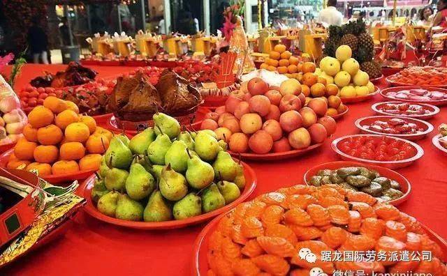 供桌上的各种贡品都有讲究,包括甘蔗以及代表五种不同寓意的水果:香蕉象征“招”,苹果象征“平安”、橘子代表“大吉”、梨象征“来”,还有黄梨代表“旺”。此外,供奉桌上也有素五牲、发糕和发财米桶,祈求一年顺利。