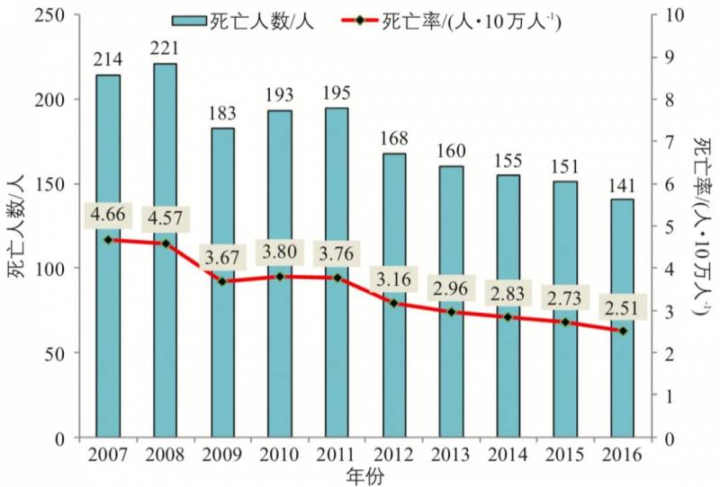新加坡拥有人口约560万人,国土面积719.2km2,建设公共道路的车道全长为9310km。注册机动车数量为90万辆,汽车和摩托车驾照持有人约180万人。尽管新加坡人口在持续增加,从2015年年中553.50万人增至2016年年中560.73万人,但是同时期的10万人交通事故死亡率却由2.73降为2.51。总之,过去10年(2007—2016年),新加坡的死亡率在持续下降(见下图)。