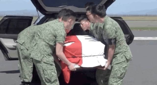 八名军人左臂缠着黑丝带,小心翼翼地将盖着新加坡国旗的棺木从机舱转移到灵车上。