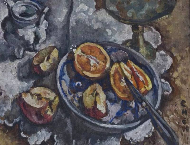 《苹果及柳橙切片》是张荔英早期的静物作品,完成于1928年至1930年。她将背景处理为深灰及褐色调,以衬托苹果及柳橙切片。这个时期她的笔触较粗放,好用多层次的厚彩凸显瓜果的触感及浑厚的立体感。