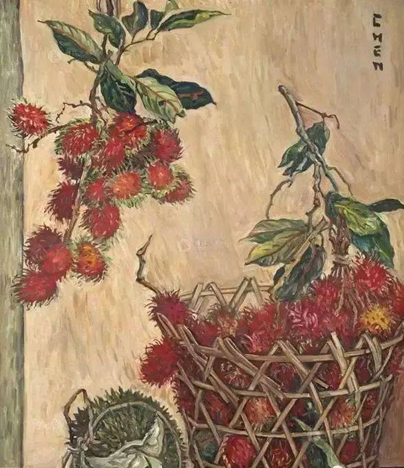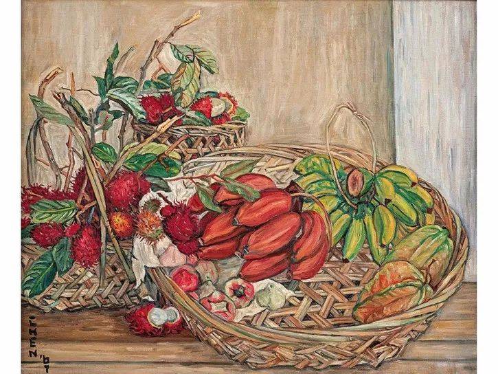 而她1969年后期的静物作品《热带水果》,手法则细腻许多,篮子里有红毛丹、凤梨、木瓜等,物象丰富、色彩饱满。由于张荔英是“目之所见,志之以笔”的画家,这些静物画遂构成重要的物证,在一定程度上反映了她创作时所处的东南亚文化环境及热带风情。