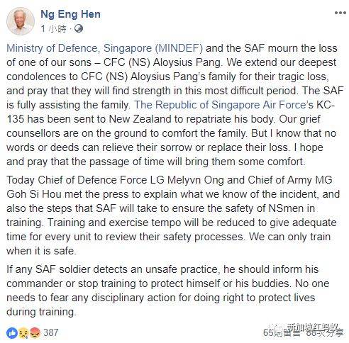 晚上7点12分:国防部长发面簿贴文宣布,已派遣新加坡空军部队KC-135空中添油机至新西兰,接冯伟衷的遗体回国。