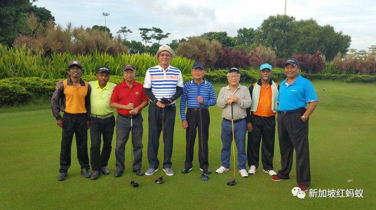 老当益壮。陈清木(左三)和吴作栋(左四)及其他友人一起打高尔夫球。两位老友都想当“国师”,就看哪一位被人当宝。(陈清木面簿)