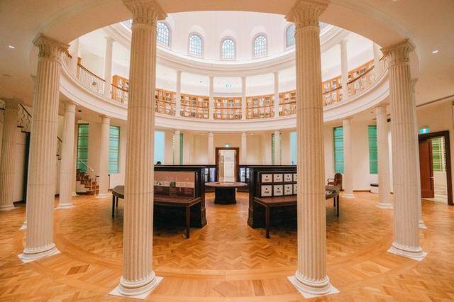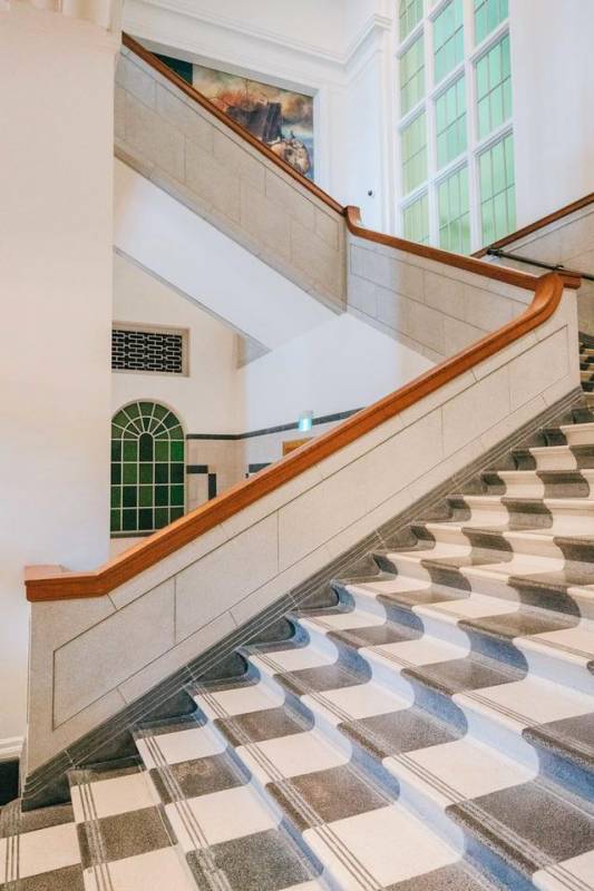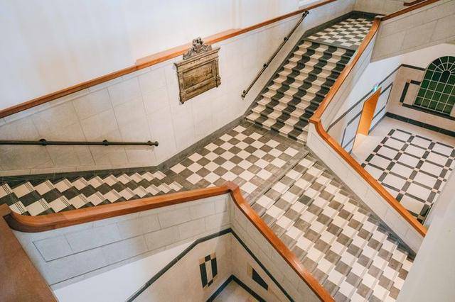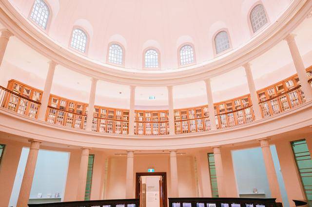 4层有个白色透明玻璃穹顶,穹顶复原了早期的法律图书馆。在美术馆里有影像资料,介绍设计师是如何复原这些室内摆设的。说是这些桌子超级贵,都是工人小心翼翼搬进来,再耐心粘贴桌面材料的。在这一层两个角落也有两个带彩色玻璃窗的小房间,可以休息。