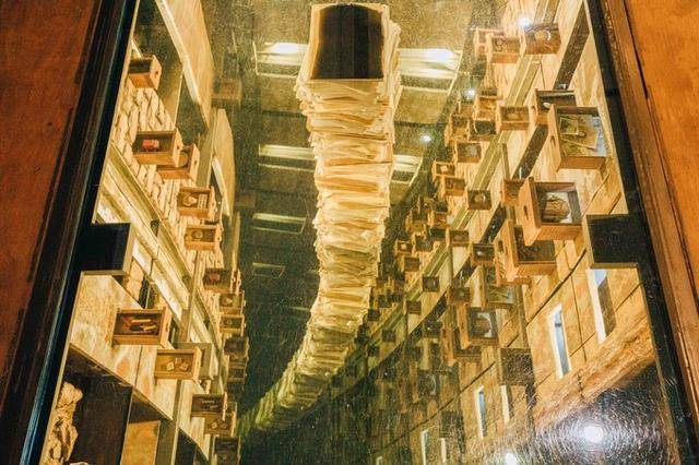 在售票处对面的公共区域,有个公开展,游客可以走到透明玻璃上,观赏装置艺术。本来看玻璃下面黑乎乎的,物品延伸到很深的地方,有种无限延伸的感觉,等我们踩到玻璃上,仔细观察,就会发现这是对称和倒影设置,不然还以为是“万丈深渊”呢。