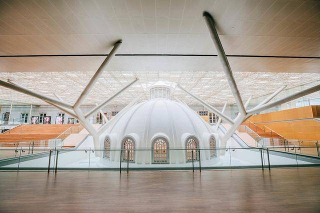 白色穹顶周围是银白色支柱,在整个美术馆都能看到这样的支柱。起码在配色上都保持高度统一了。