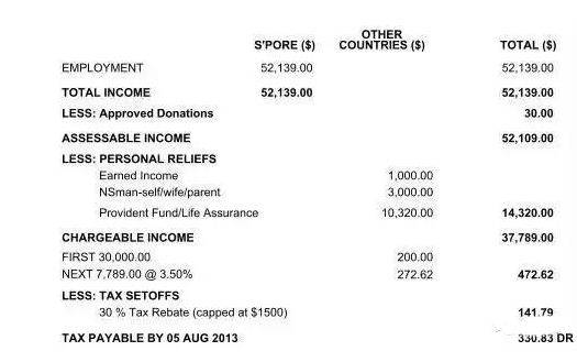 新加坡的个人所得税并不是简单的基于年收入,因为会有一些税收抵扣。比如上图中是一位工薪阶层的纳税单(2013年)。可以看到他的年收入为5万2千新币(约合人民币25万元),在扣除了一些抵扣后(比如公积金CPF等),他需要上缴的年收入为3万7千新币,需要缴的税为330新币,实际税率为0.6%。