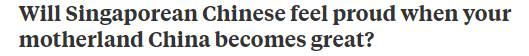 你可能已经看到这里大部分的答案都在强调,新加坡华人是新加坡人,不是中国人(国籍上来说)。我将会从另一个角度解读这个问题。我要说,新加坡人应该为中国崛起而感到高兴。