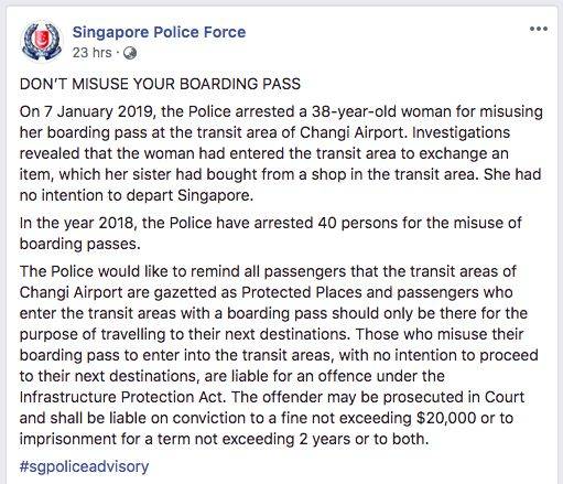 滥用登记证进入过境区的人士,无意出境,将在受保护地区法令下受罚。违规者将可能被控上法庭,面临20000新元以下罚款,或被判监禁两年,或是两者兼施。