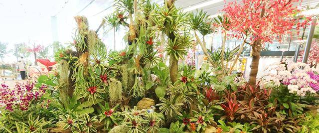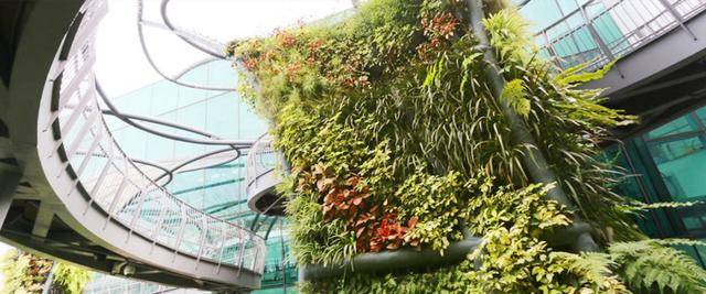 樟宜机场树形雕塑花园内拥有三个巨大的树形雕塑,上面覆有各种鲜花与观叶植物,远看仿佛鲜花绿叶被施了魔法。