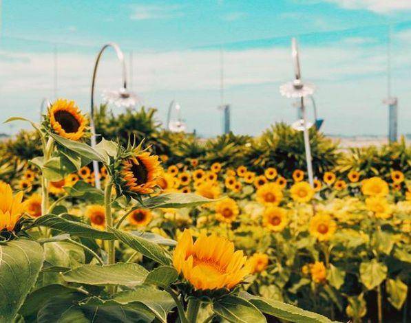 在阳光沐浴下,500多株向日葵像500多张金灿灿的笑脸,幸福的绽放着。呼吸花瓣的味道,享受阳光的温暖或者在休憩港湾观赏壮观的飞机跑道和停靠港的美景。