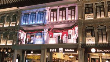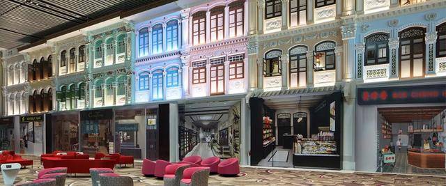 传统文化区是以新加坡土生华人的商店风格为基础,以传统狮城风格的外墙、内部设计与家具营造出怀旧的氛围。中间有个LED屏放舞台迷你剧场《娘惹之恋》,蛮有趣的设计。