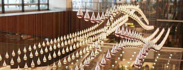 全球最大型、也是最复杂的动力雕塑,608颗镀铜水滴轻盈地悬在半空,随着音乐,舞动出一片金色波浪。从抽象的艺术造型,到栩栩如生的飞机、热气球、风筝,甚至是龙的形态,每一次变幻都让人禁不住发出“哇”~