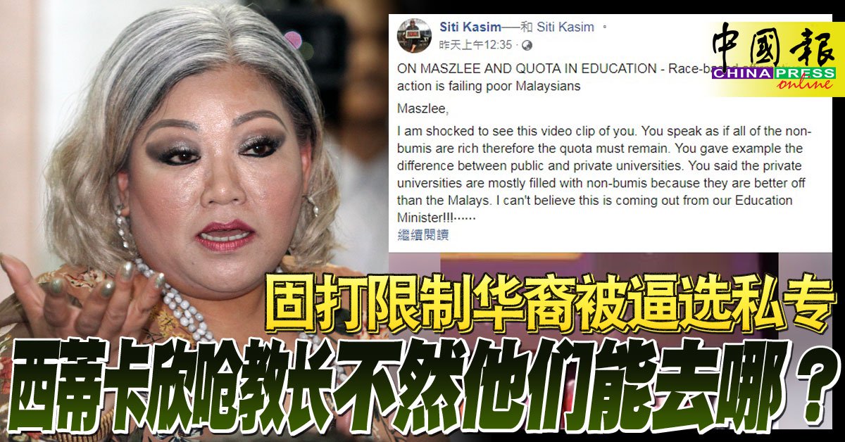 (吉隆坡20日讯)人权律师西蒂卡欣指出,国内私立大专很多非土着生就读的原因很简单,因这些家长没能力送子女出国深造,及固打制问题而无法进入本地大学就读,因此她反问教育部长马智礼:“那你觉得他们能去哪?”。