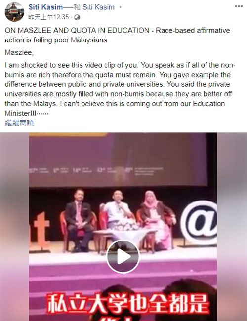 西蒂卡欣在面子书质问马智礼,想让非土著学生去哪里?