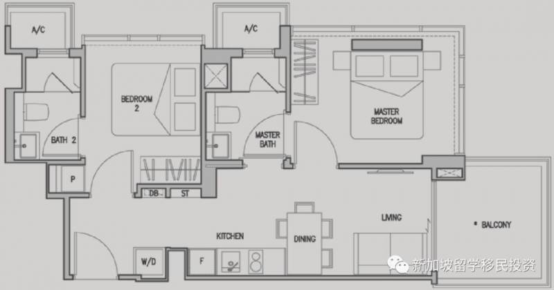 C2户型 2室 双钥匙 635平方英尺 / 59平方米
