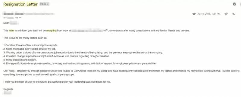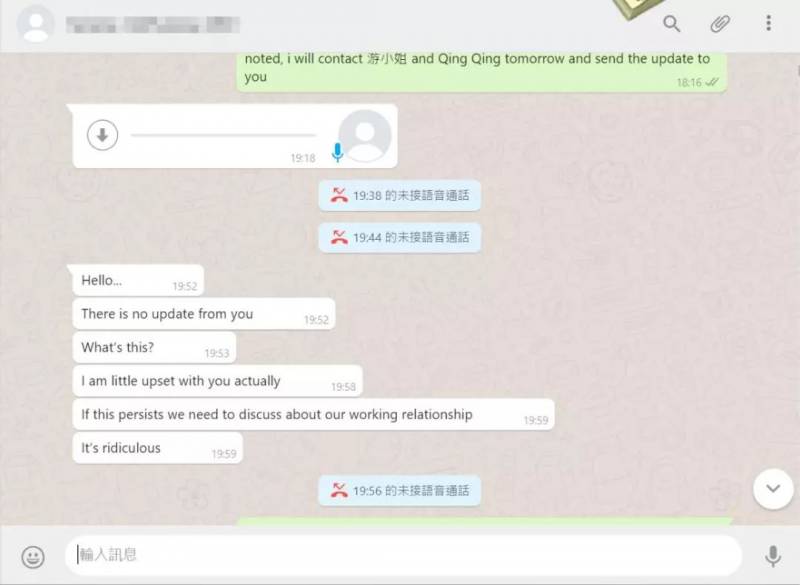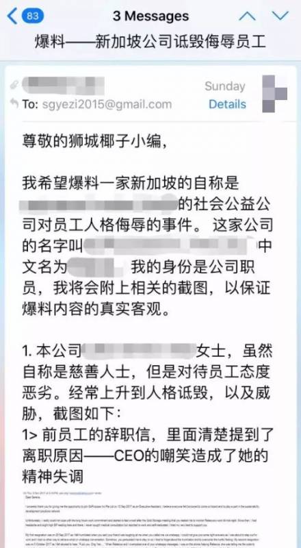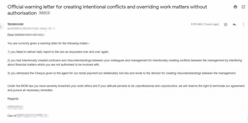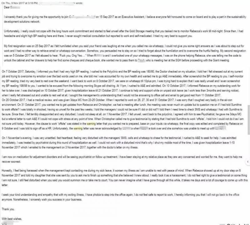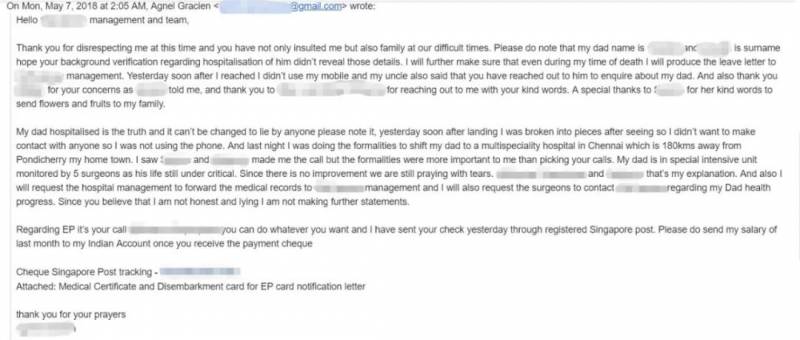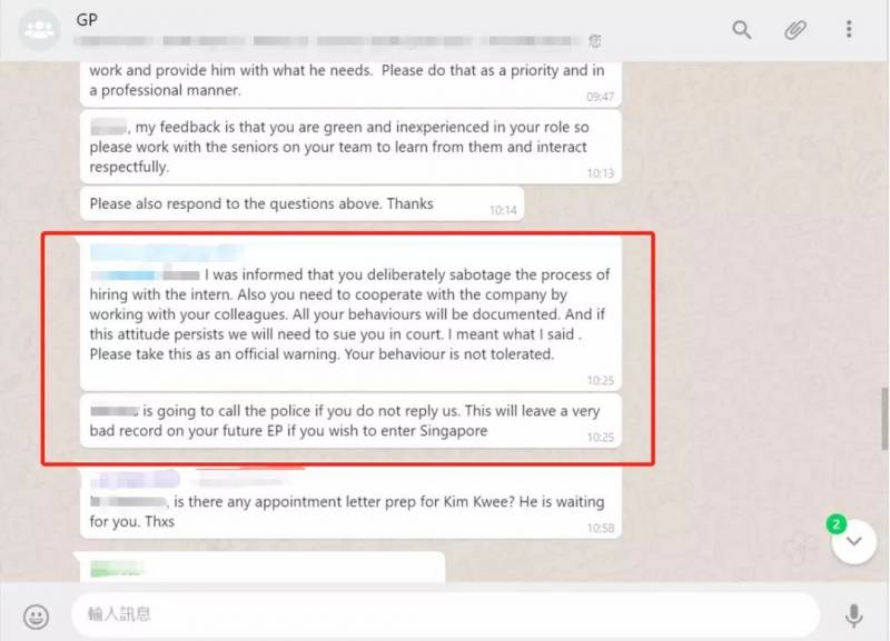 (某同事)将要报警了,如果你再不回复我们。这将会给你的EP留下非常坏的记录,如果你未来还希望留在新加坡。