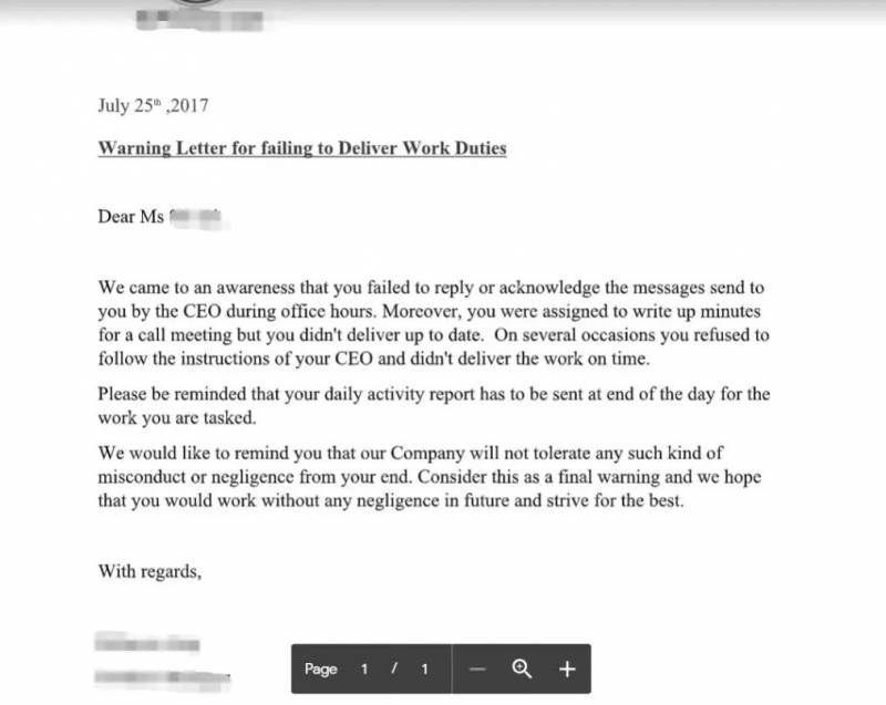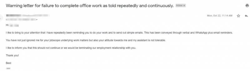”I was informed that you deliberately sabotage the process of hiring with the intern. Also you need to cooperate with the company by working with your colleagues. All your behaviours will be documented. And if this attitude persists we will need to sue you in court. I meant what I said. Please take this as an Official warning. Your behaviour is not tolerated. “