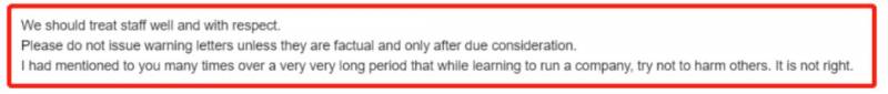 你应该好好对待你的员工并尊重他们。请不要随意发警告信,应该基于事实和经过慎重考虑。我很早就跟你说,在学习管理公司的过程中,不要伤害他人。