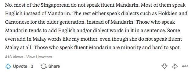 许多新加坡人并不会讲流利的普通话,大多数人讲英文。剩下的一部分人讲方言比如闽南话和粤语(大多是老一辈人)。那些会讲中文的通常是一句话中中英混杂,还会加入一些方言的词汇,甚至是马来语,比如我妈妈,虽然她并不能够讲流利的马来语。那些能够讲好普通话的人太少了。