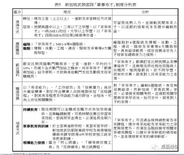 (三)建立军事专业人员学(经)管理机制,规划职涯发展远景:新加坡武装部队“军事专才“与”军官”,“准尉,士官”,并列三轨化军阶制度,除依职责须共同执行军事任务外,ME1至ME8的编阶设计,具有学(经)管理发展纵深的独特性,在ME1到ME3阶段,以实务历练和专业能力为发展基础。ME4以上阶级加重领导责任,并以“持续教育”,“专业军事教育与训练”及“领导能力发展”等三种方式,培育人员专业基础与实力,建议可借鉴“军事专才”学(经)历管理的作法,对于须与军,士官共同执行军事任务之专业人员,应参照军,士官学,经管理方式,依其任务特性及职务需求,规划专门的学(经)管理制度,以利擘划职涯发展远景,鼓励专业人员认真投入工作。