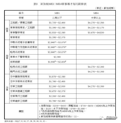 (二)增列相关专业领域加给,提升各职务专业能量:“军事专才”阶级区分ME1至ME8,共8个分阶,惟同阶的薪资依其学历不同,而有所差异,例如陆军ME1工程师,薪资依学历区分,国中毕业为新加坡币1870元,高中毕业为新加坡币2210元,二专毕业为新加坡币2400元,显见对专业人员能力之重视。借镜新加坡对人才专业重视程度,建议对于专业人员取得符合职务所需之学历,证照及研究成果等条件,增列相关专业领域加给,以肯定其专业与能力,有效鼓励人员强化职务专业度,并提升各职务领域专业能量。