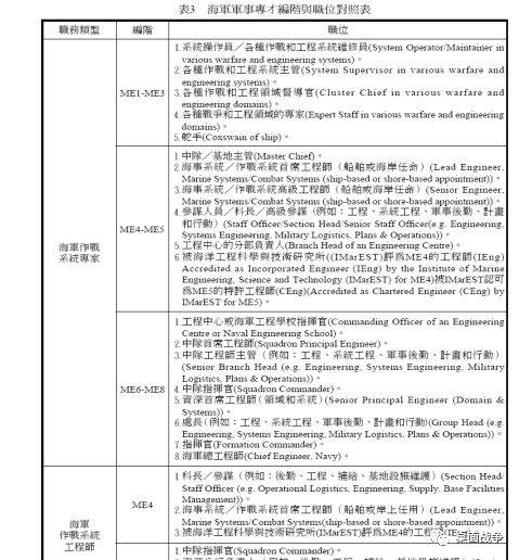 1.海军作战系统专家(Naval Warfare System Expert)区分海军作战系统电子设备专家(Naval Warfare System Expert(Electronics)),海军作战电力及控制系统专家(Naval Warfare System Expert (Electrical and Control Systems)),海军作战船用系统专家(Naval Warfare System Expert(Marine Systems))及军事水下医学专家(Military Medical Expert (underwater)) 、海军医师(Naval Chef)等5类职务类型。各职务编设ME1-ME8等8级军阶,并设置系统操作员至海军总工程师等相关职务。