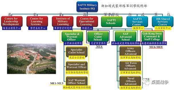 专业军事教育与训练是“军事专才”未来发展重要阶段,依不同的军种及阶级至“新加坡武装部队军训学院”所属“士官与准尉学院”,“见习军官学府”,“新加坡武装部队高级学校“及”吴庆瑞指挥与参谋学院”等4所学校实施军事教育训练,并采三级培训制度,培育具有领导,卓越,克服精神的新加坡国防官员。其组织主要区分“教育资源”,“军事学校“及”行政单位”等三大部分(如图8所示)。课程规划依ME1-8不同阶段需求开设,以陆军军事专才为例,ME1-ME3的军事课程于士官与准尉学院(SWI)实施,ME 4的军事课程于见习军官学府(OCS)实施,ME5的军事课程于新加坡武装部队高级学校(SAS)实施,ME6以上阶级的军事课程于吴庆瑞指挥与参谋学院(GKS CSC)实施(如图9所示)。