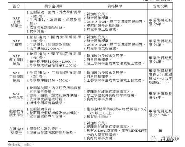 区分SAF奖学金(The SAF Scholarship),SAF工程奖学金(SAF Engineering Scholarship),SAF优异奖学金(SAF Merit Scholarship),SAF学术奖学金(SAF Academic Scholarship),SAF工程奖(SAF Engineering Award),SAF理工学院补助(军事专才)(SAF Polytechnic Sponsorship(MDES)),军事专才学术奖励(文凭)(MDES Academic奖金(Diploma))等7种奖学金制度(如表7所示)