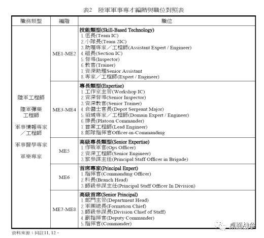 区分陆军工程师(Army Engineer),陆军弹药工程师(Army Engineer(Ammo)),军事情报专家/工程师(Military Intelligence Expert/Engineer),军事医学专家(Military Medical Expert)及军乐专家(Military musician)等5类职务类型。各职务均编设ME1-ME8等8级军阶,ME1-ME2以技能类型(Skill-Based Technology)职位为主,ME3-ME4以专长类型(专业)职位为主,ME5以高级专长类型(高级专长)职位为主.ME6以首席(Principal Expert)等职位为主,ME7-ME8以高级首席或局,处长(高级首席专家/首席专家)等职位为主(如表2所示)。