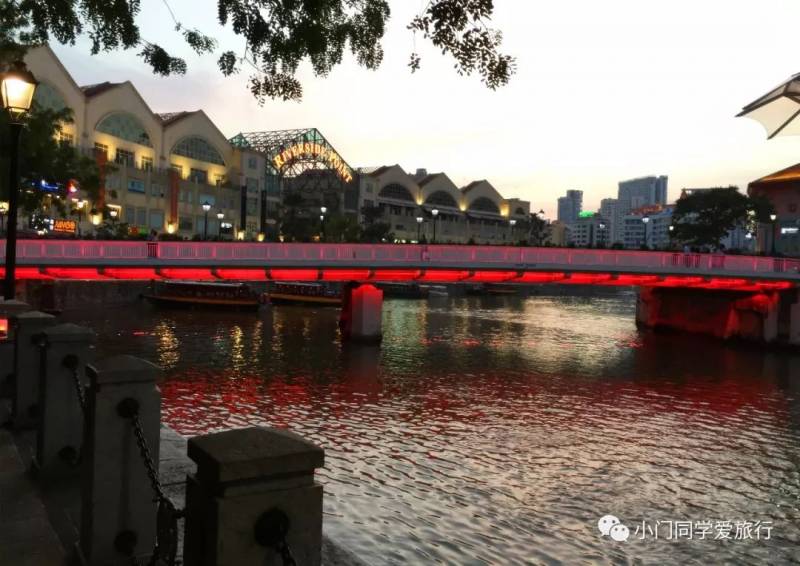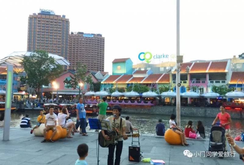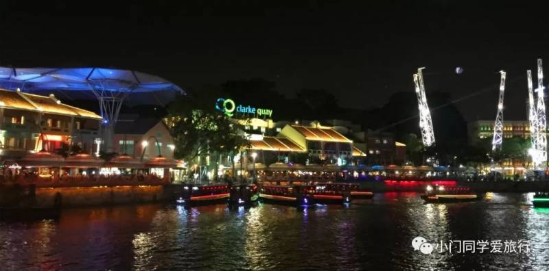 这里白天很冷清,夕阳西下的时候就是克拉码头苏醒的时候。河边有表演的艺人,各种酒吧人声鼎沸,餐厅门口摆满了桌子,坐满了客人,两岸河水倒映夜色流光溢彩,新加坡河上的游船往来穿梭,所以说克拉码头是属于夜晚的。