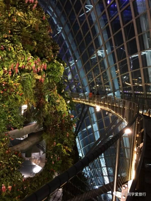 然后顺着指示乘电梯直达七层,从最高处沿钢结构的空中走廊盘旋而下,欣赏世界各地的奇花异草。