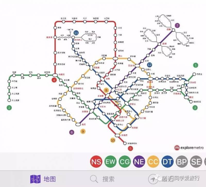 建议提前下载一个新加坡地铁的APP,做攻略选酒店方便随时查询。地铁的主要线路有红线(NS)、绿线(EW)、黄线(CC)、紫线(NE)、还有新建的蓝线(DT)
