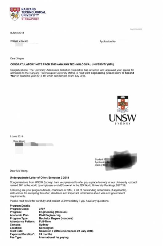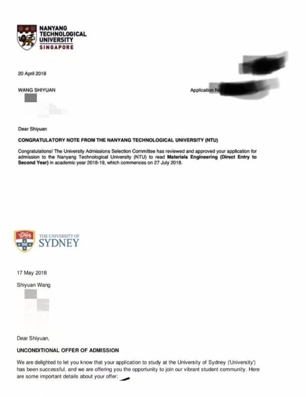 WANG SHIYUAN同学 GPA3.95 同时被NTU和雪梨大学录取