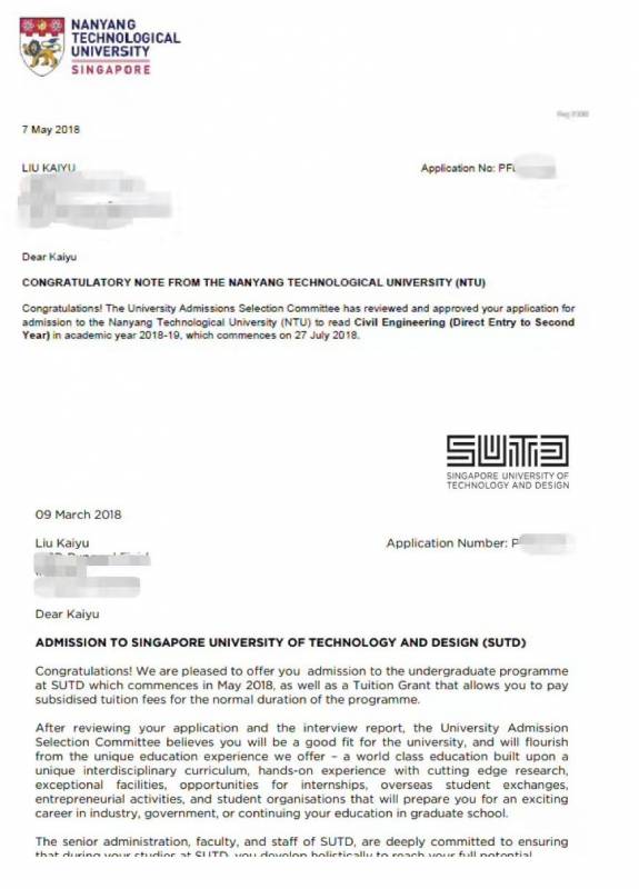 LIU KAIYU同学 GPA3.90 同时被NTU和SUTD录取