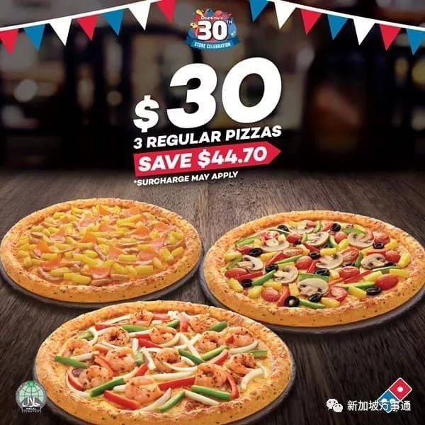 30新元可以买到3张披萨吗?答案是可以的!Domino's为了庆祝第30家店开业,特别推出3张披萨30新元的超级折扣~