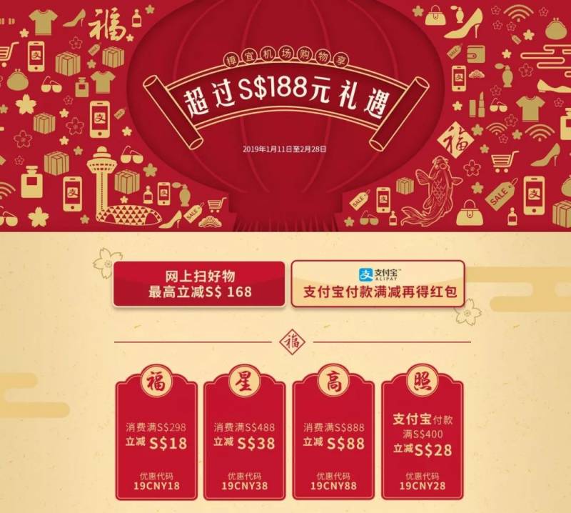 除了各种让人眼花缭乱的满减活动,凡在2019年1月11日至2月28日期间,在iShopChangi上购物的顾客,使用上文中任一折扣码,还将获赠一枚精美的红包封!(限从樟宜机场起飞出发旅客,先到先得,领完为止)