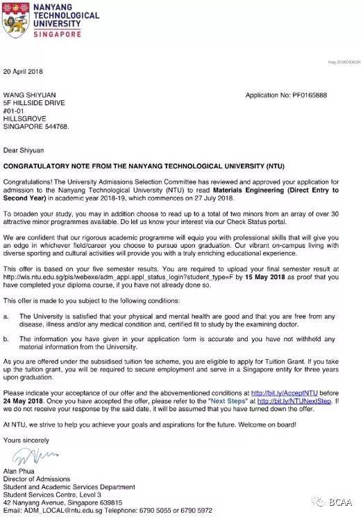 闫同学,2015年新加坡某私校A水准学生。2015年4月入读BCAA建筑工程专业,2018年4月毕业。同年4月9日被南洋理工大学材料工程专业录取,8月份直接入读本科第二年。