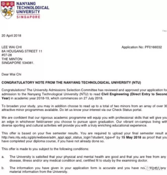 李同学,新加坡某私校O水准学生,英文7分,5科总分17分 。2016年4月入读BCAA,6月入读两年制快捷课程,2018年4月BCAA毕业。同年4月20日被南洋理工大学土木工程本科专业录取,8月份直接入读本科第二年。