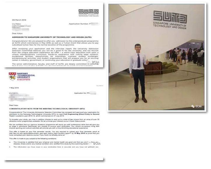 刘同学,新加坡某私校O水准学生,英文7分,5科总分17分。2016年4月入读BCAA,6月入读两年制快捷课程,2018年4月BCAA毕业。3月9日被新加坡科技设计大学IT专业录取,5月7日被南洋理工大学土木工程本科专业录取。最后选择5月份入读科技设计大学。