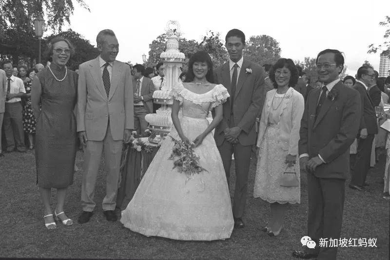 1981年7月18日,李光耀与夫人柯玉芝出席李显扬与林学芬的婚礼。李显扬与林学芬都就读于国家初级学院,两人在国初的时候认识彼此。右一为林学芬的父亲、知名经济学者林崇椰。(海峡时报)