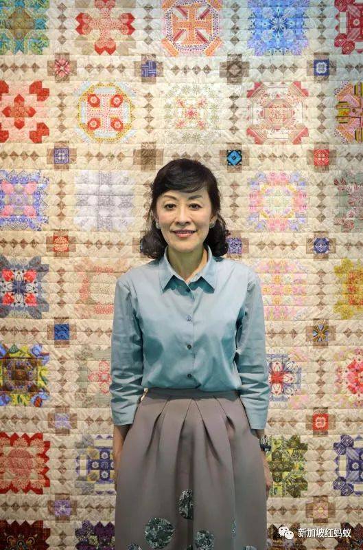 2014年林学芬摄于住家。身后挂着的就是她缝制的拼花被子。看到吗?她裙子上有几个拼花图案,据说是她自己缝上去的,既美观又可遮盖咖喱酱污渍。(海峡时报)