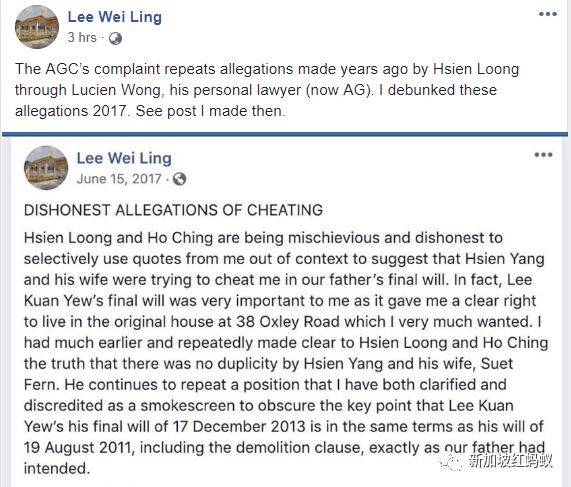 今早,轮到林学芬的大姑李玮玲声援。她重发2017年6月的帖文称,总检察署的投诉和李显龙好几年前通过私人律师黄鲁胜(现在的总检察长)所做的指控是一样的,而她早就已经驳斥了。