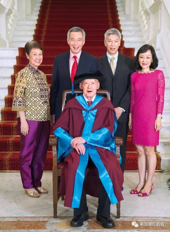 2013年6月,建国总理李光耀获颁新加坡国立大学名誉法学博士学位,与家人一起合照。站者左起:李显龙夫人何晶、李显龙总理、李显扬和妻子林学芬。
