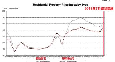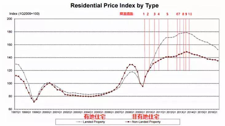 图片来源网络,为1997年-2016年间的私宅价格指数表,其中10根红线记录了10轮降温措施的时间点。
