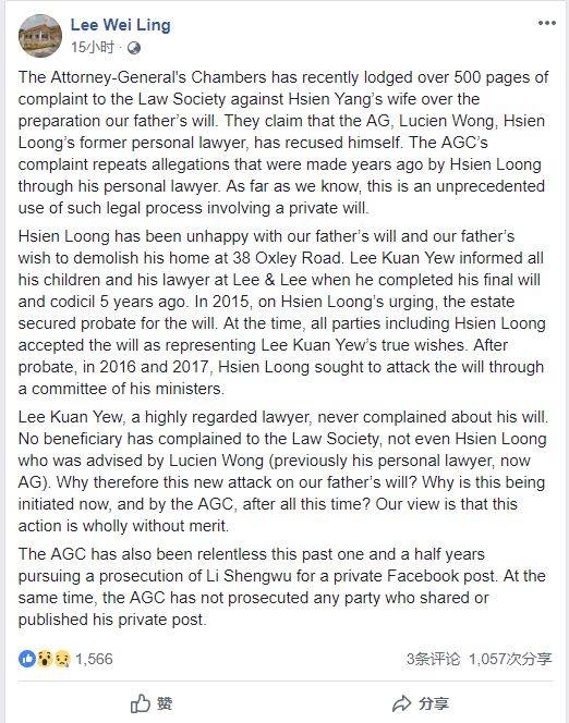 “我的心情非常沉重,我将在可预见的未来离开新加坡。这是我的父亲李光耀热爱和建立的国家。它一直是我全部人生的家园。新加坡是,并将一直是我的祖国。我并没有离开的意愿。李显龙是我离开的唯一原因!”